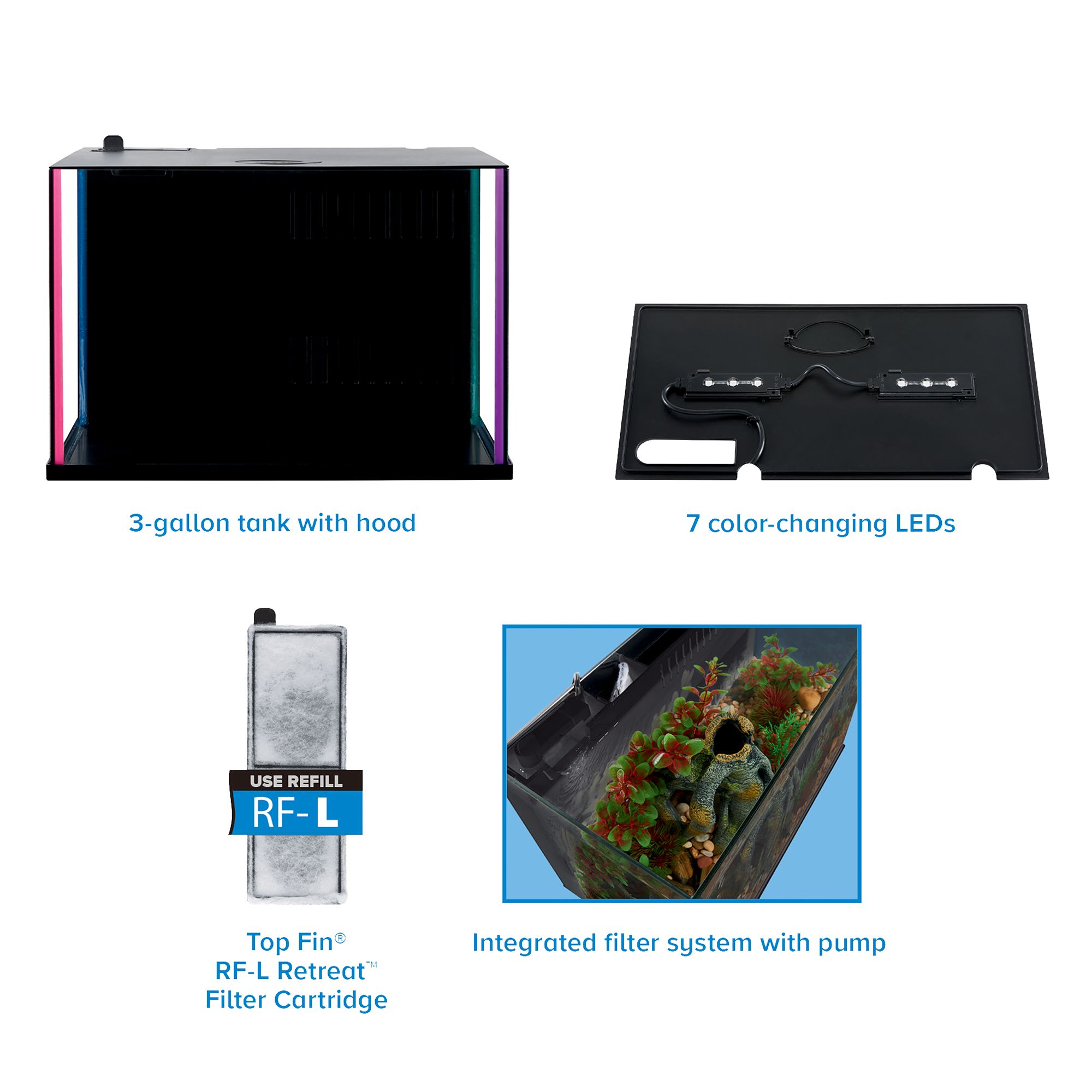 The words TOP FIN are molded into the top of the filter. The models included in this recall are Top Fin Power Filters 10 20 30 40 and 75. My poor betta couldnt even swim across the tank. TopFin 5G Integrated Filtration System aquariums are 2999 through the 6th at Petsmart. LED lighting system beautifully accentuates. Top Fin aquarium products include high-quality fish tanks starter kits tank filters cartridges and air pumps gravel backgrounds décor cleaning tools water conditioners replacement filter media fish food and more. However the TopFin 5 gallons come with a 10 gallon filter.